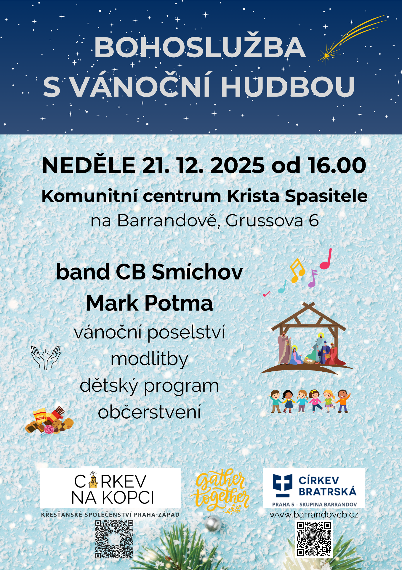 Čekají vás vánoční písně v podání bandu z CB Smíchov, vánoční poselství Marka Potmy na téma Tajemství inkarnace, modlitby, dětský program, občerstvení.