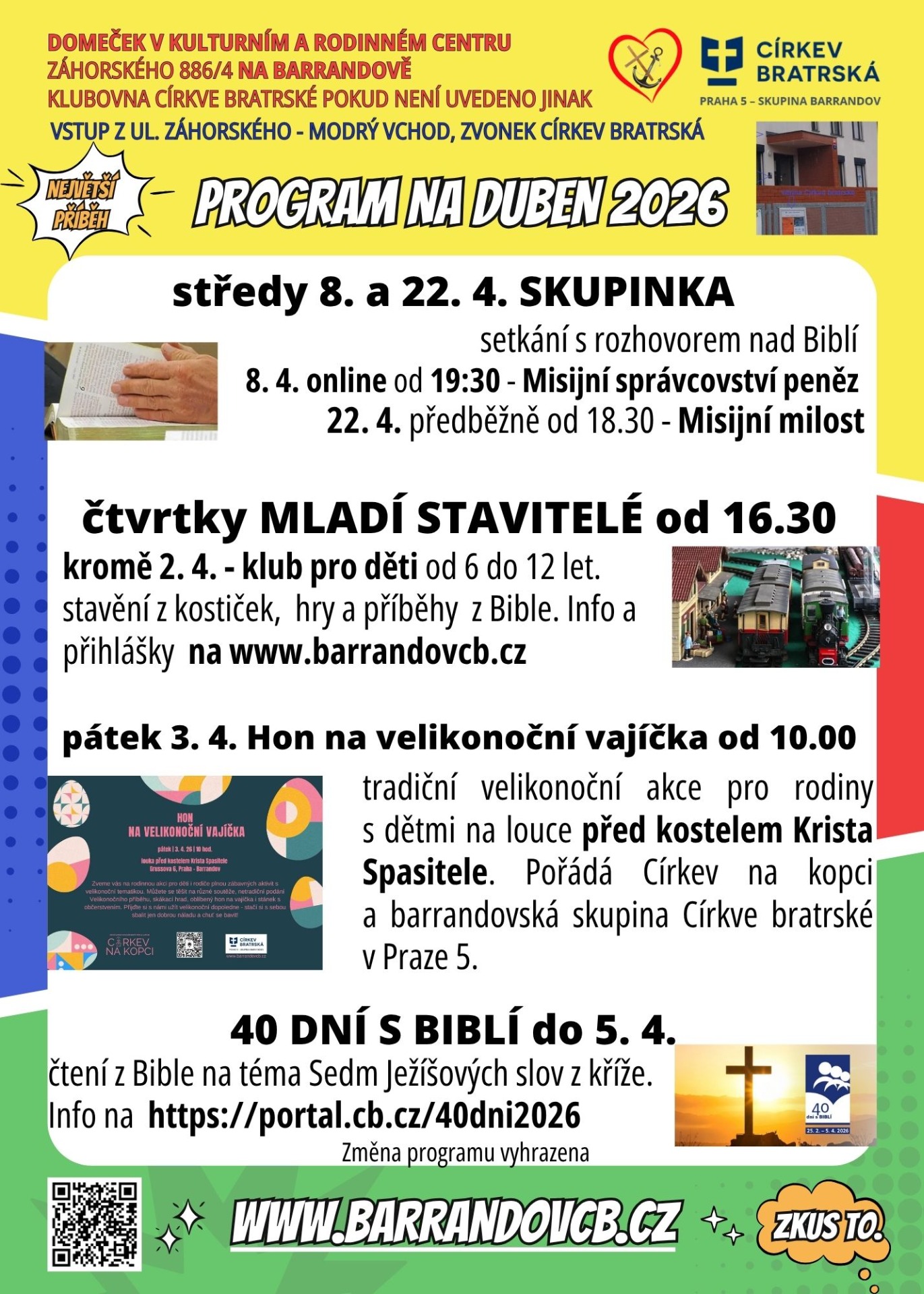 Setkání se konají v Kulturním a rodinném centru Záhorského 886/4 na Barrandově - Grussova 6 a Hon na velikonoční vajíčka před kostelem Krista Spasitel.