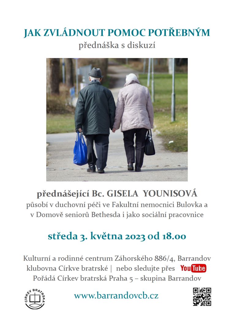 Zveme vás na přednášku Gisely Younisové s diskuzí na téma Jak zvládnout pomoc potřebným, která se bude konat ve středu 3. května 2023 od 18:00 v Kulturním a rodinném centru Záhorského 886/4 na Barrandově v klubovně Církve bratrské. Bc. Gisela Younisová působí v duchovní péči ve Fakultní nemocnici Bulovka a také v Domově seniorů Církve bratrské Bethesda i jako sociální pracovnice.